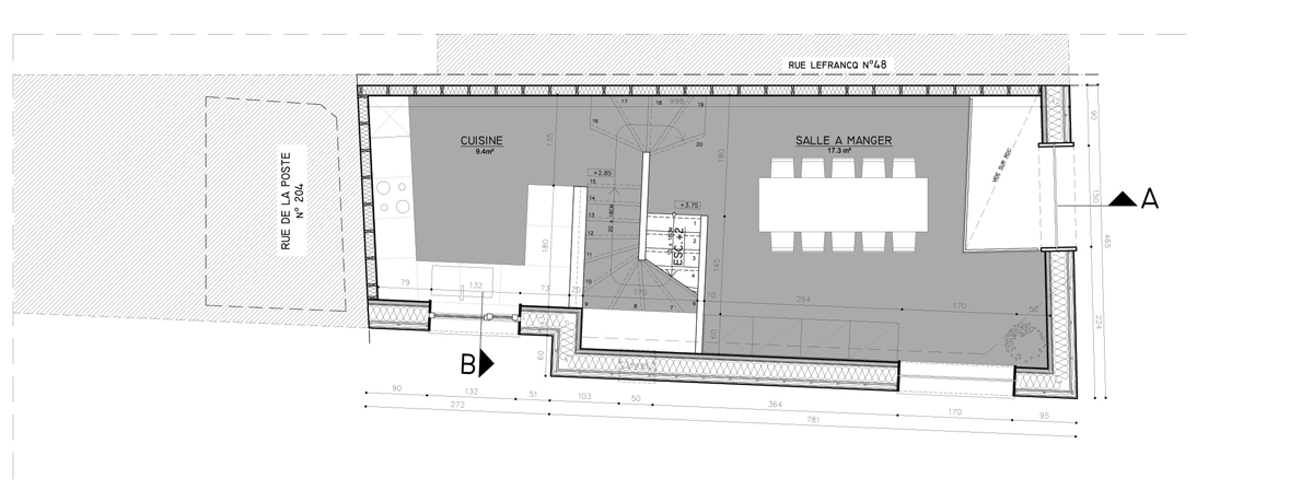 Le projet consiste dans la création d’un nouvel accès à un bâtiment de bureaux situé dans la rue Jos de Brouchoven, entre la rue du Meyboom et le boulevard Pacheco dans le centre de Bruxelles. Dans cet étrange goulot, face à la cité administrative, mais dans le dos du quartier Marais-Jacqmain, à la fois passage obligé et rue dérobée, le maître d’ouvrage souhaitait doter le bâtiment de bureaux d’une entrée propre et par là même d’une identité reconnaissable. Un accès comme une passerelle vient cueillir le public sur le trottoir pour l’amener à l’intérieur du bâtiment. Cette passerelle a été entièrement préfabriquée en atelier y compris le bardage extérieur et les revêtements intérieurs et ensuite transportée, posée et raccordée au bâtiment existant. L’accès s’exprime avec force, en dialogue avec l’austérité du contexte, fait de façades répétitives et d’un aménagement urbain coupé à la serpe. La structure métallique, par son dimensionnement exigeant, affiche la fragilité du quasi porte-à-faux. Les baguettes de céramique émaillées expriment la force des teintes de couleurs. La tôle perforée filtre la lumière et enrichit l’atmosphère si particulière propre à ces espaces au seuil entre l’intérieur et l’extérieur.